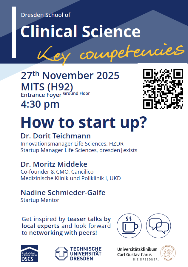 To pursue successful careers in translational research, scientific key competencies and a thriving network are as essential as methodological expertise. The Dresden School of Clinical Science (DSCS) meets this need with the seminar series "Clinical Science Key Competencies".