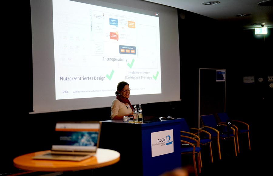 Einer der Symposiumsbeiträge kam aus unserem Team von Katja Hoffmann vom Standort Dresden (Technische Universität Dresden | Universitätsklinikum Carl Gustav Carus Dresden). Sie präsentierte ein nutzerzentriertes Dashboard zur Therapieplanung beim diabetischen Makulaödem, entwickelt im Projekt MiHUBx in Zusammenarbeit mit Prof. Dr. Kathrin Engelmann, Gabriel Stolze, Jayden Maurice Tannenhauer (Klinikum Chemnitz gGmbH), Sophia Grummt und Hamed Mishian.