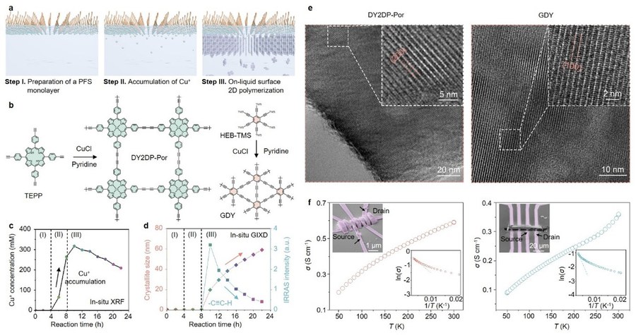 a,b) Schematic illustration of the synthetic procedure for DY2DPs on the DMAc-H2O surface. c,d) In-situ XRF and GIXD measurements for the 2D polymerization on the DMAc-H2O surface. e) TEM images of DY2DP-Por and GDY crystals. f) Temperature-dependent conductivities of DY2DP-Por and GDY crystal device with Pt contacts.