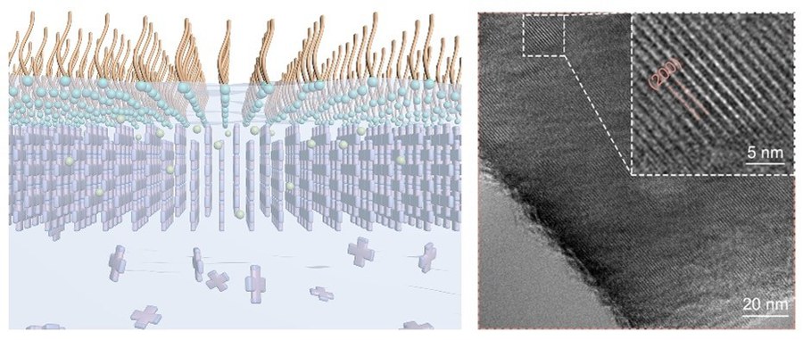A recent article by researchers from the TU Dresden and Max Planck Institute of Microstructure Physics, published in Nature Communications, presents an on-liquid surface (a mixture of N,N-dimethylacetamide and water, DMAc-H2O) synthesis method for constructing diyne-linked 2DP (DY2DP) crystals via Glaser coupling, assisted by a perfluorosurfactant (PFS) monolayer. In-situ spectroscopic and diffraction techniques reveal that the well-ordered PFS monolayer facilitates the accumulation of Cu+ ions and subsequent vertical coupling of acetylenic monomers on the DMAc-H2O surface. Building on these findings, we successfully synthesized microscale rod-shaped DY2DP-Por or graphdiyne (GDY) crystals through the polymerization of porphyrin- or benzene-based monomers, respectively. Our study represents a significant advancement in the field of on-liquid surface chemistry and opens up enormous opportunities for constructing C–C bond-linked 2DP crystals with unique functionalities.