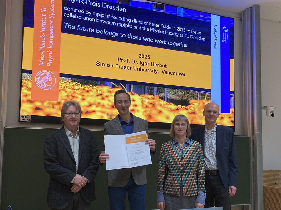 Am 18. November 2025 ist der Physik-Preis Dresden 2025 an Prof. Igor Herbut von der Simon Fraser University in Kanada vergeben worden. Mit der Auszeichnung werden herausragende Forschende geehrt, deren Arbeiten für die Wissenschaftscommunity in Dresden von besonderem Interesse sind. Der Preis stärkt die Zusammenarbeit zwischen dem Max-Planck-Institut für Physik komplexer Systeme (MPI-PKS) und dem Fakultät Physik der TU Dresden und soll die wissenschaftliche Attraktivität des Standortes weiter erhöhen.