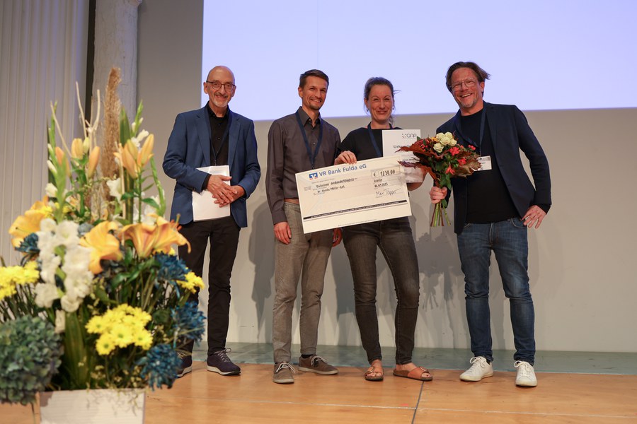Presentation of the GNP Early Career Research Award in Leipzig. From left to right: Dipl.-Psych. PD Dr. Bruno Fimm (Aachen, Scientific Advisory Board GNP), Dipl.-Psych. Frank Uecker (Magdeburg, Hasomed® GmbH), Dr. rer. nat. Christa Müller-Axt (TUD Dresden University of Technology), PD Dr. rer. nat. Max Töpper (Bielefeld, GNP Executive Board)