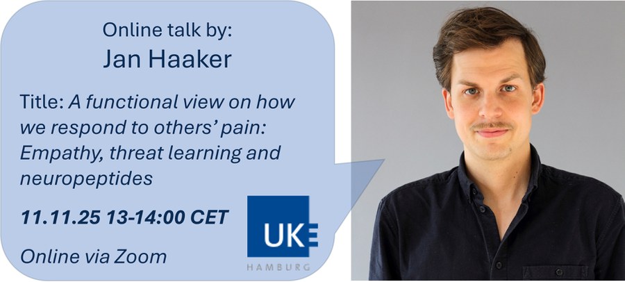 We cordially invite you to an online lecture by Jan Haaker on "A functional view on how we respond to others’ pain: Empathy, threat learning and neuropeptides".