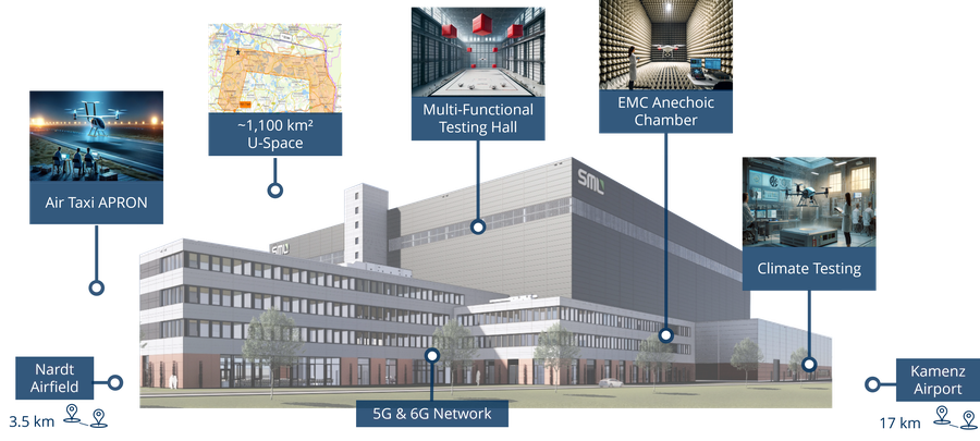 TAFAS combines different test environments under one roof - from indoor flight hall and climate room to EMC absorber room, outdoor test area and vertiport. This infrastructure forms the basis for practical experiments, validation and certification of UAVs and eVTOLs.