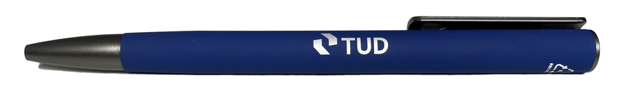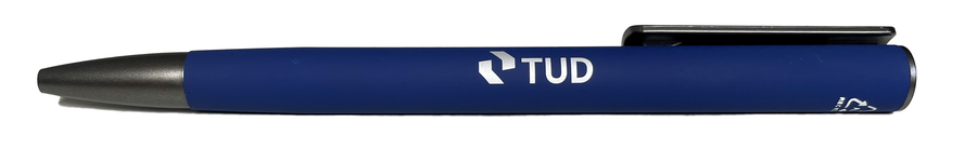 TUD Kugelschreiber aus recyceltem Aluminium in blau mit silberner Gravur TUD-Logo (Kurzversion)