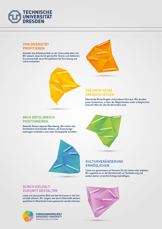 Im Kern sollte eine Verknüpfung von Grundlagen- und Anwendungsforschung erfolgen. Neben der Beschreibung der Geschlechterkulturen in verschiedenen Fachrichtungen bzw. Fakultäten der Universität sollte langfristig die Sensibilisierung für die Genderthematik in den beforschten Bereichen weiter entwickelt werden. Überdies wurden die Forschungsergebnisse in Form von Handlungsempfehlungen für die Praxis aufbereitet, um so einen Beitrag zu einer gendersensiblen Organisationsentwicklung der TU Dresden zu leisten.