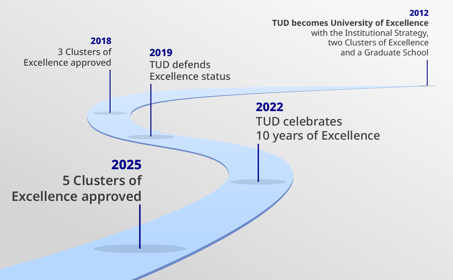 Welcome to TUD Dresden University of Technology's Journey of Excellence. TUD has been one of the German Universities of Excellence since 2012 and has achieved remarkable progress and success during this time. In the following, we would like to present the most significant milestones and accomplishments that have shaped our university in recent years. Join us in looking back on an exciting and successful chapter!