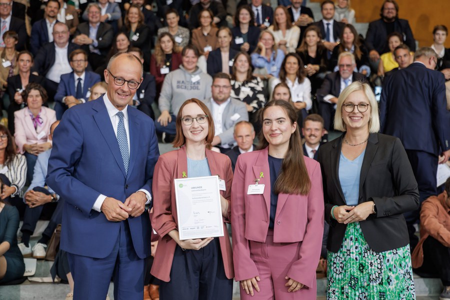 The university group Team AufeinanderAchten (Look after each other) at TUD Dresden University of Technology is committed to raising awareness of and destigmatizing stress and mental illness. For their commitment and in particular their “first aid courses for the soul,” the students have now been honored by Federal Chancellor Friedrich Merz as one of the seven national winners of the 2024/25 startsocial competition. The prize was awarded to the student group alongside the supporting association AufeinanderAchten, which was founded by three TUD psychology graduates.