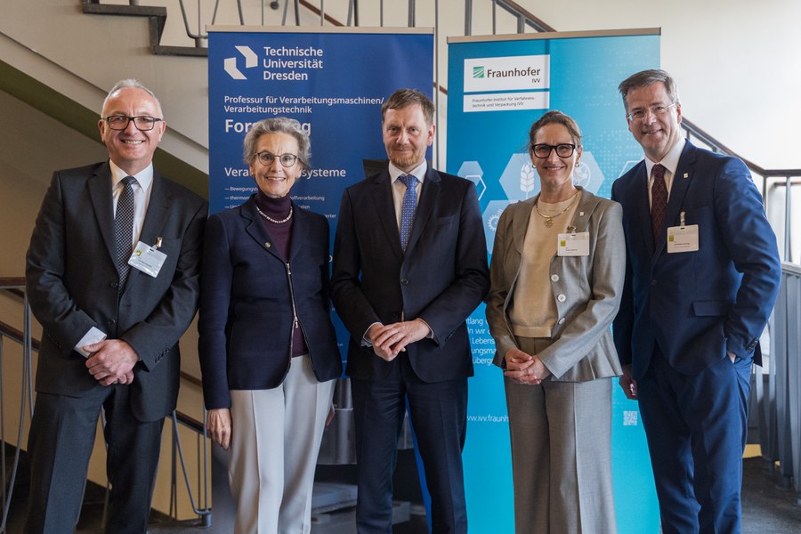 v.l.: Prof. Jens Majschak (Inhaber der Professur für Verarbeitungsmaschinen/Verarbeitungstechnik an der TUD und Institutsleiter Fraunhofer IVV), Prof. Ursula Staudinger (TUD Rektorin), Michael Kretschmer (Ministerpräsident des Freistaates Sachsen), Prof. Andrea Büttner (Geschäftsführende Institutsleiterin Fraunhofer IVV), Prof. Axel Müller-Groeling (Fraunhofer-Vorstand)