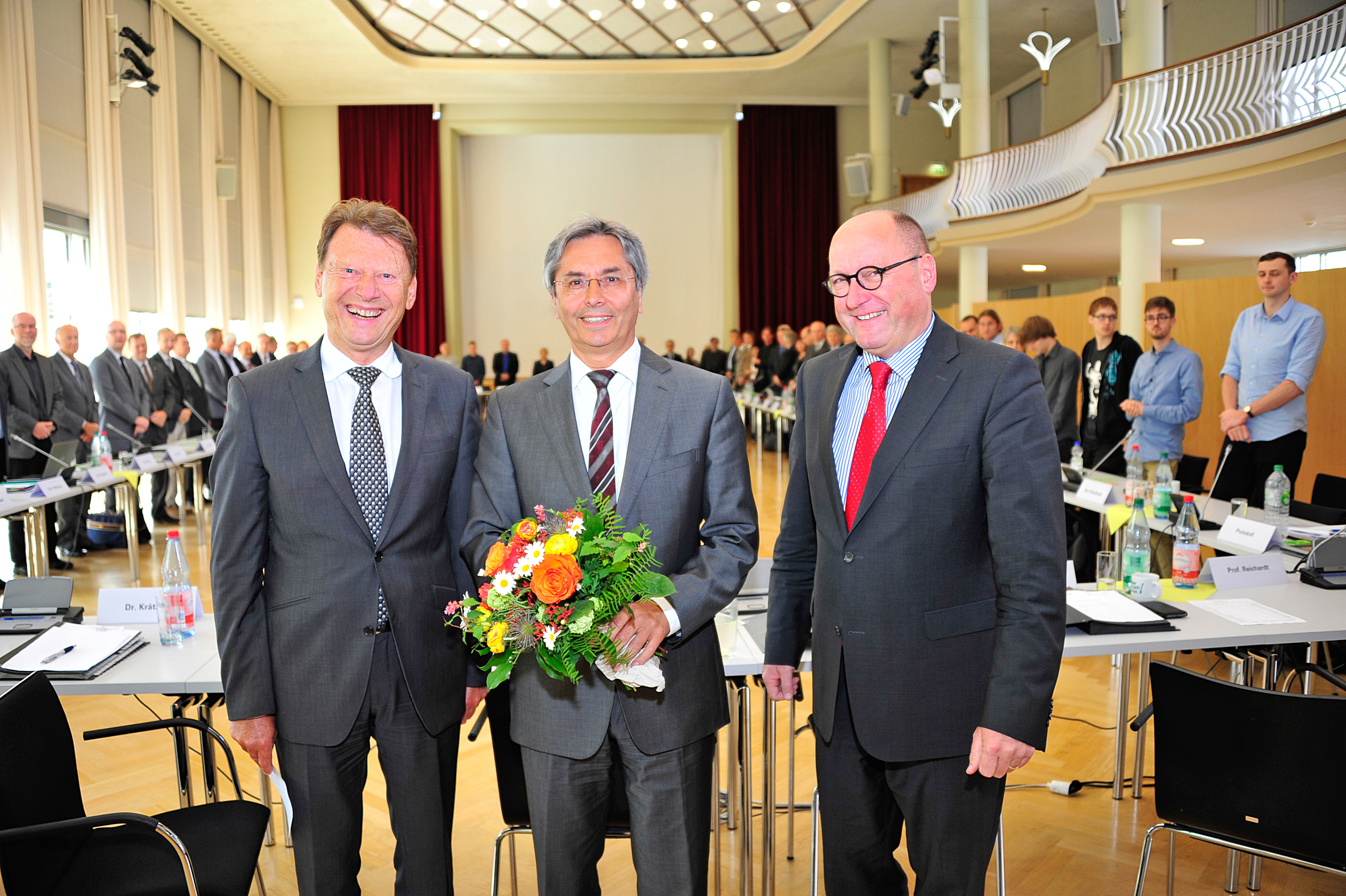 Foto (Wahl des Rektors Prof. Hans Müller-Steinhagen (M.) am 13.5.2015. Links Wahlleiter Prof. Hans-Ulrich Wittchen, rechts der Stellv. Vorsitzende des Hochschulrats, Prof. Klaus Raps, Foto: TUD/Karsten Eckold)