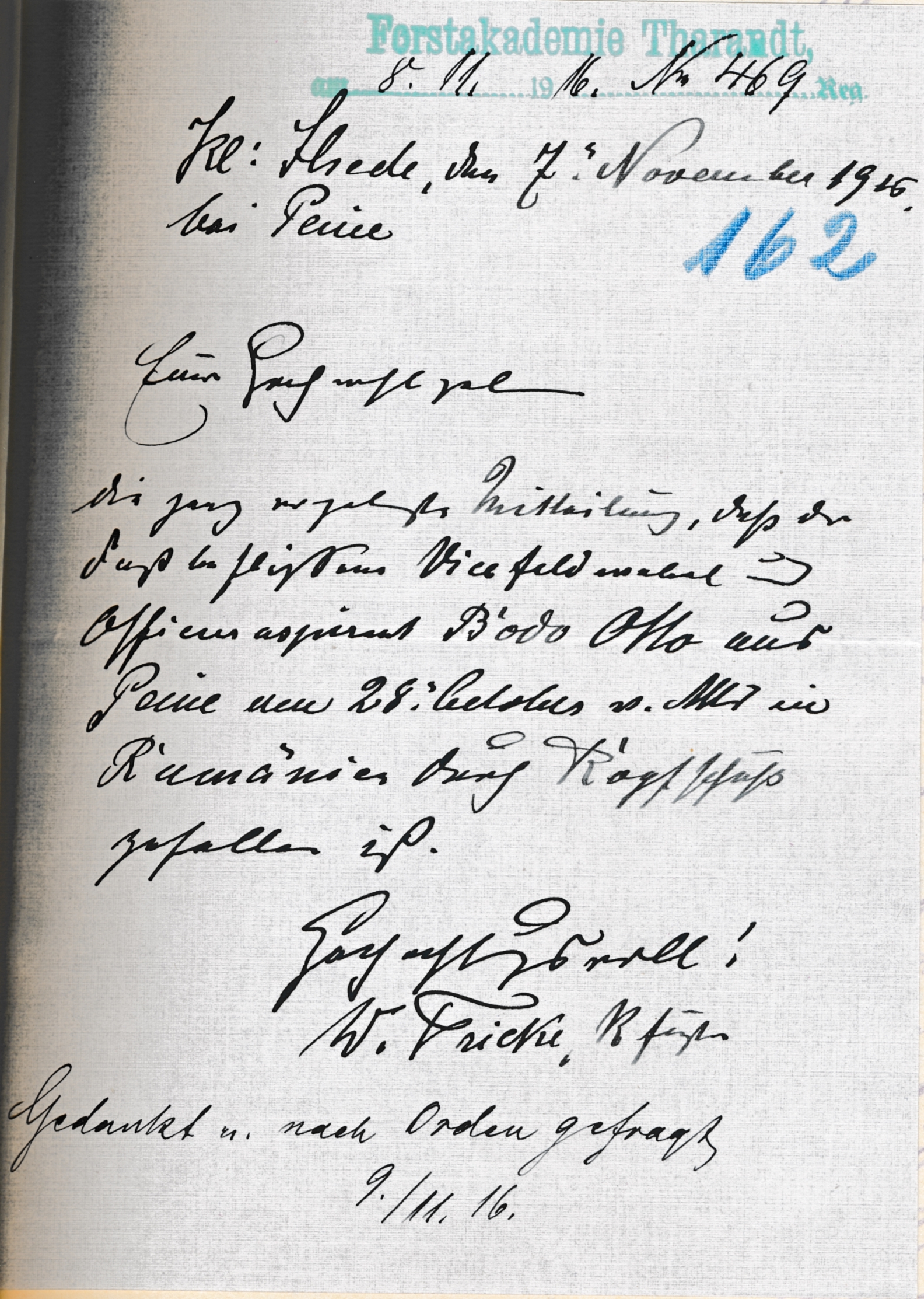 Schreiben der Eltern des gefallenen Studierenden der Forstakademie Tharandt, Alfred Singer, im Oktober 1916