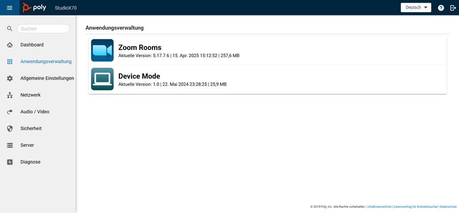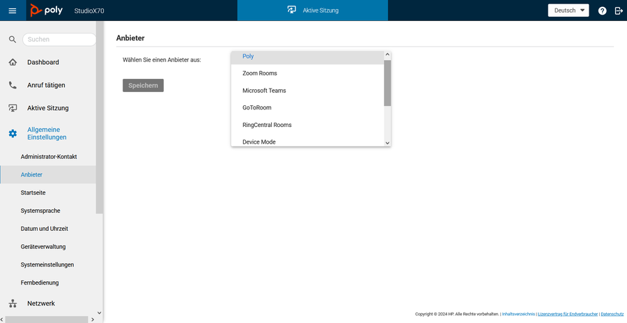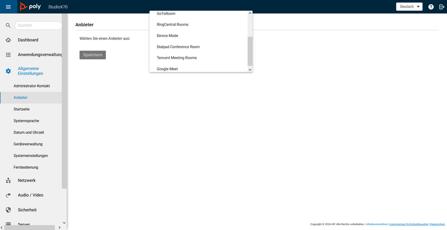 Als sogenannte Anbieter für den Partnermodus stehen aktuell (November 2025) mit der SW-Version Poly VideoOS 4.6.0 Zoom Rooms, MS Teams, GoToRoom, RingCentral Rooms, Tencent Meeting Rooms und Google Meet zur Auswahl.