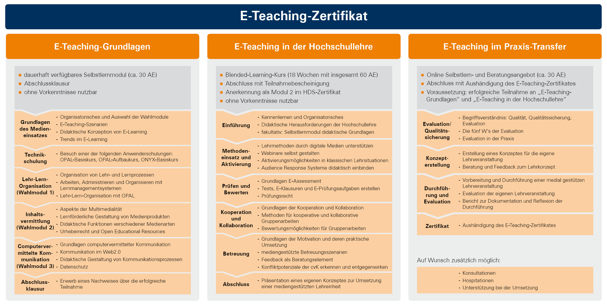 The qualification program has a total scope of 120 AE (45 min each) and is divided into three independent modules, which conclude with the e-teaching certificate: