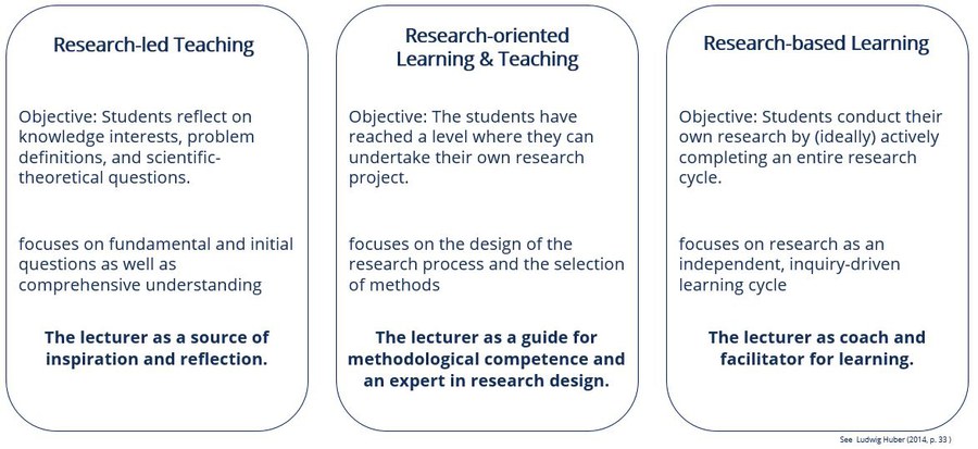 Our aim is to present three different concepts that can be used to link teaching and research - and to make them comprehensible by means of clearly defined terms. What they all have in common is student orientation and the integration of suitable teaching methods to promote research-based learning, although the scope of student research activities varies in the different approaches.