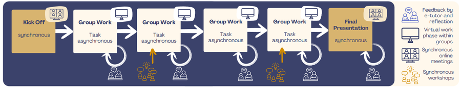 Ein typisches VCL-Projekt erstreckt sich über drei bis acht Wochen und kombiniert synchrone und asynchrone Lernphasen. Den Auftakt bildet eine synchrone Kick-off-Veranstaltung, in der Ziele, Ablauf und Erwartungen geklärt sowie die Arbeitsgruppen gebildet werden. Im Anschluss beginnt die Gruppenarbeit. Die Studierenden bearbeiten in regelmäßigen Abständen sogenannte "Tasks", die jeweils unterschiedliche Aspekte der Fallstudie aufgreifen und gezielt neue Herausforderungen setzen. Nach jeder abgeschlossenen Task erhalten die Gruppen differenziertes, gruppenspezifisches Feedback, das sowohl inhaltliche als auch prozessbezogene Aspekte aufgreift. Den Abschluss des VCL bildet eine Abschlusspräsentation, in der die erarbeiteten Lösungen reflektiert und diskutiert werden. 1