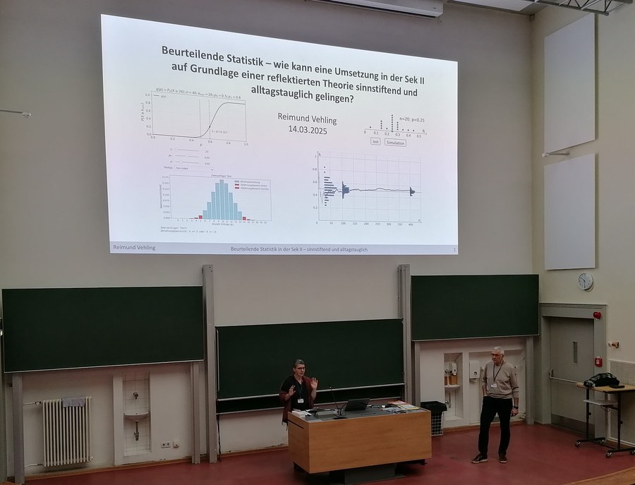 On Friday morning, around 50 teachers and around 40 conference participants gathered in the lecture hall of the Potthoff Building for the opening lecture by Prof. Dr. Thomas Skill (Bochum University of Applied Sciences) on the topic of "(Applied) Statistics - what is it?". After a short break, there was a further lecture on the topic of "Evaluative statistics - how can it be implemented in secondary school II on the basis of a reflective theory in a meaningful and practical way?" by Reimund Vehling (retired student seminar in Hanover).
